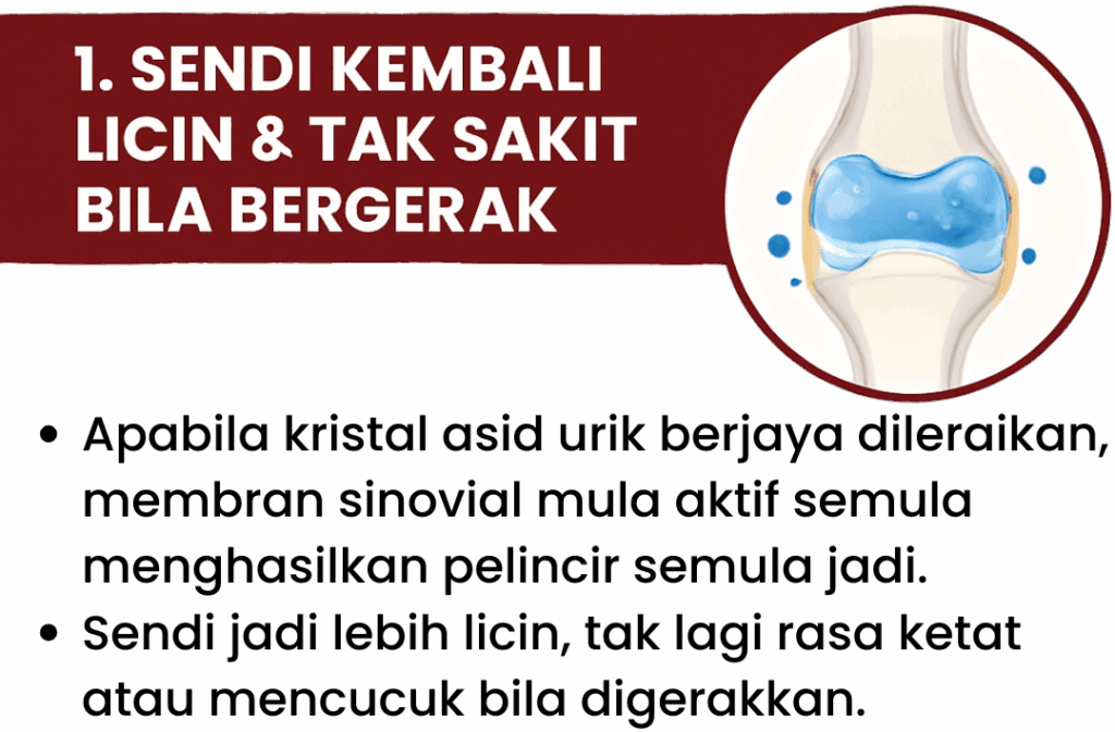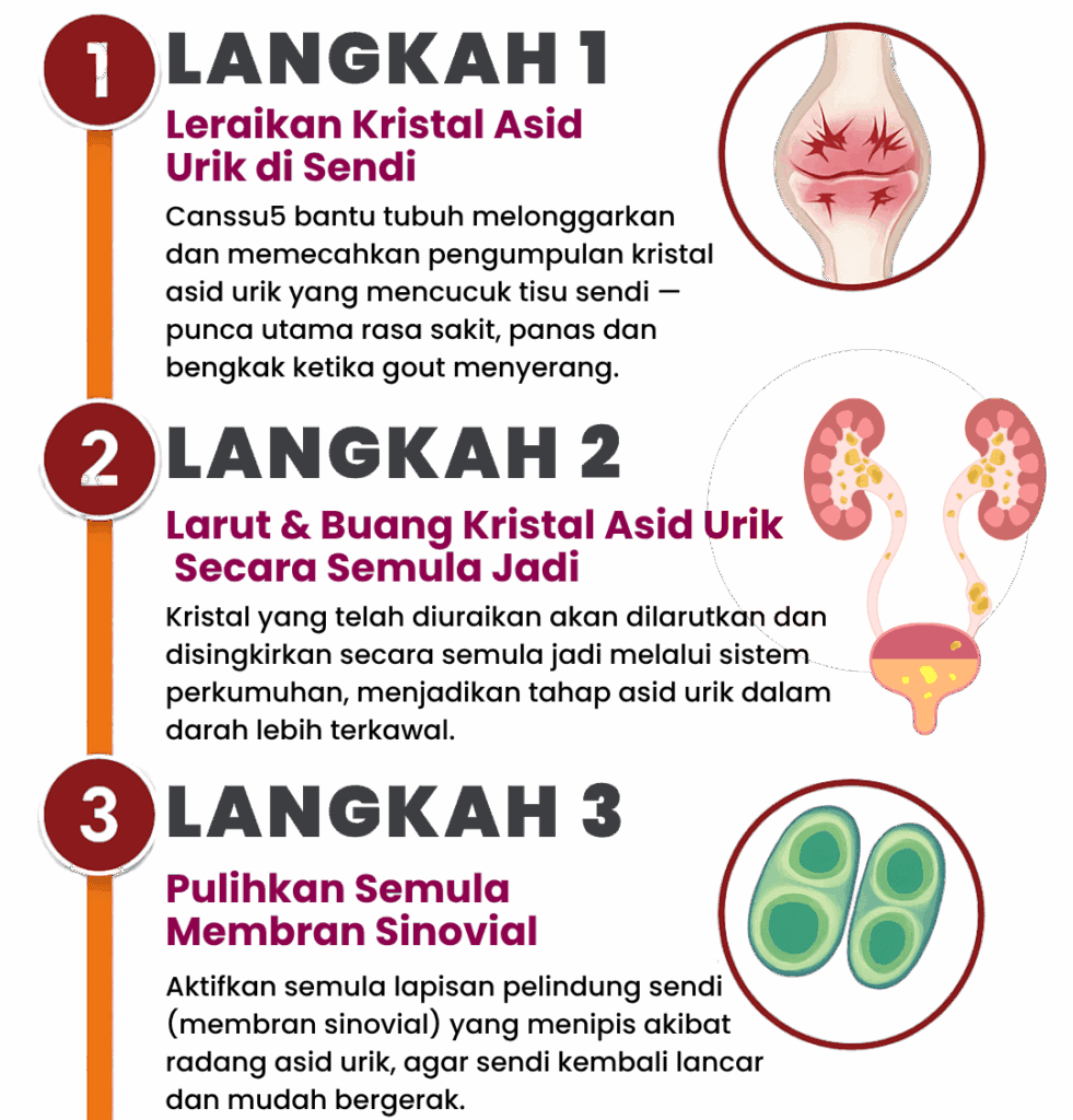 Canssu5 bantu tubuh larutkan dan buang kristal asid urik dari sendi – bukan sekadar legakan sakit, tapi rawat punca gout dari dalam.