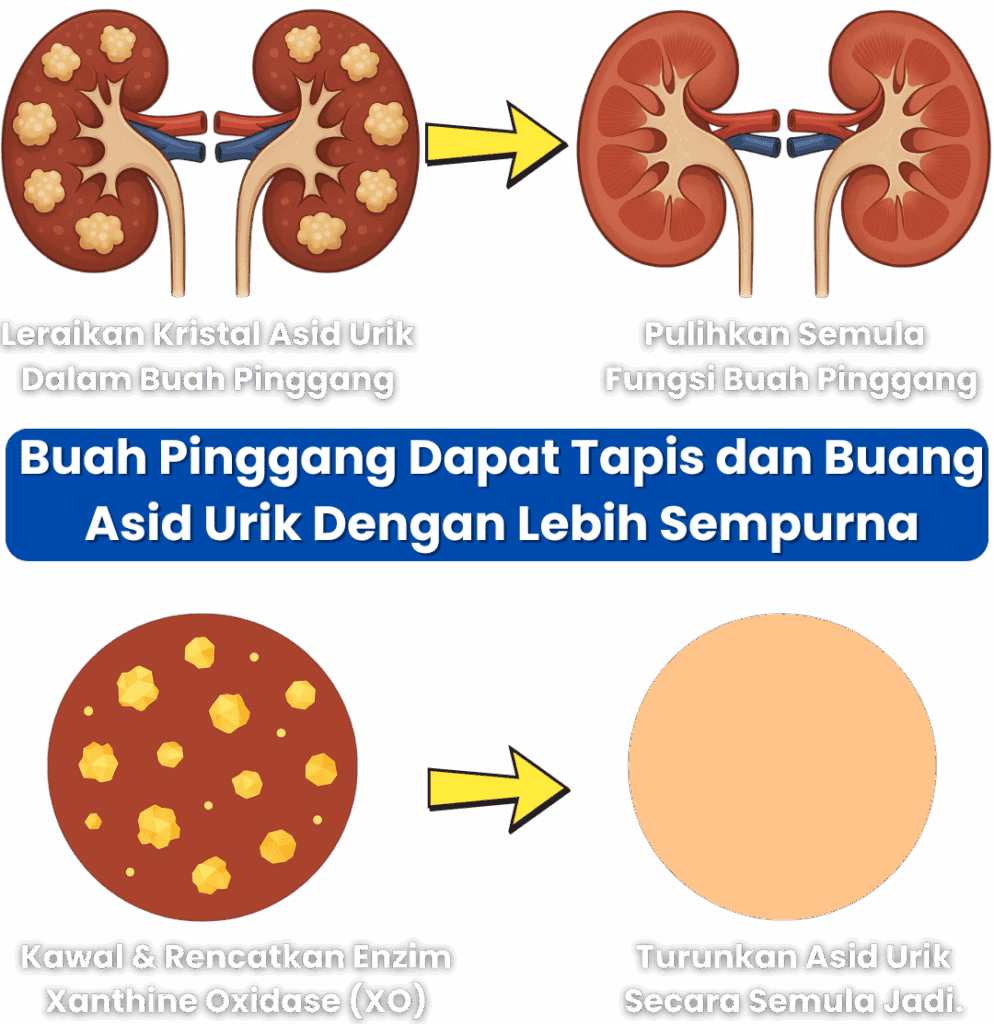 – Merawat fungsi buah pinggang supaya dapat menapis asid uric dan menyingkirkannya melalui air kencing.