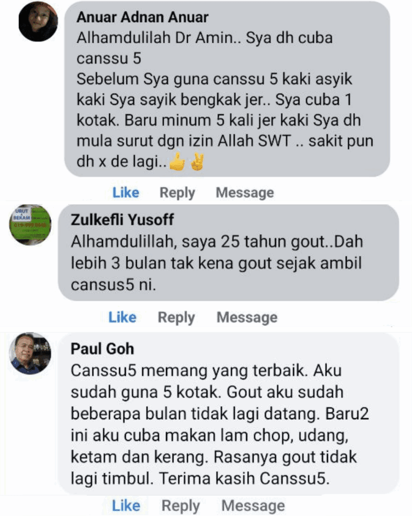 Untuk kes Masalah Gout. Anda perlu berjumpa dengan doktor dahulu untuk dapat bacaan asid urik selepas mengamalkan Canssu5.