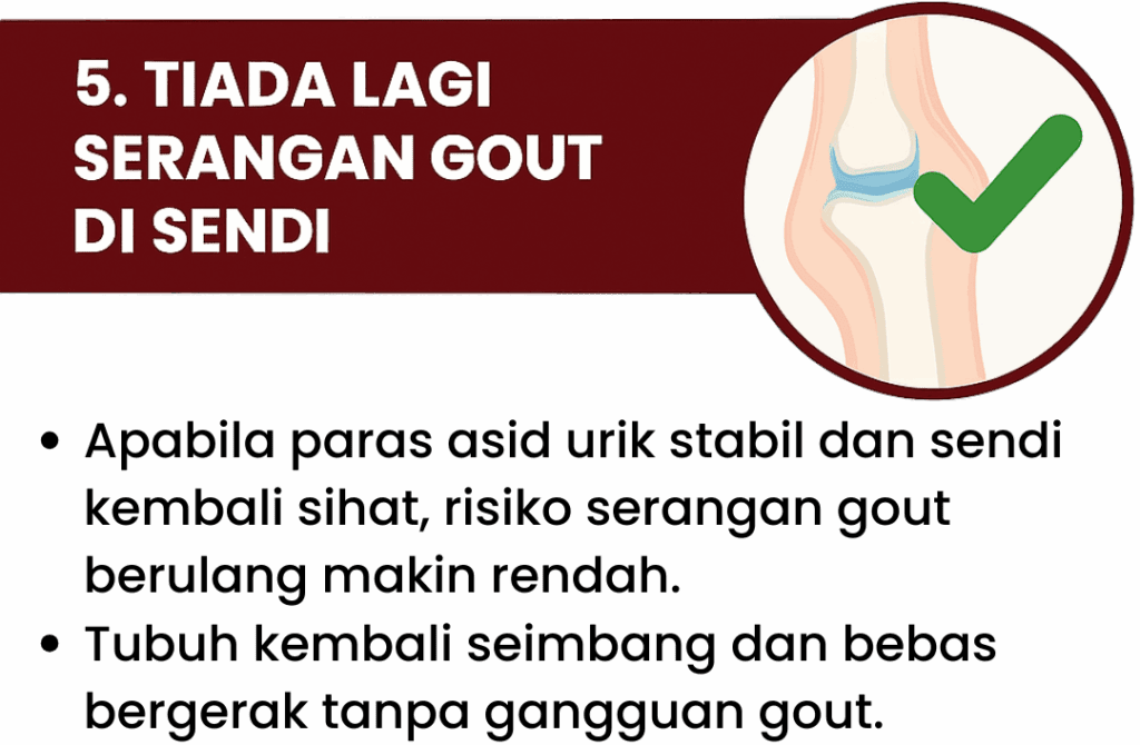 → sakit serangan gout semakin kerap → risiko bengkak dan pembentukkan tophi Gout