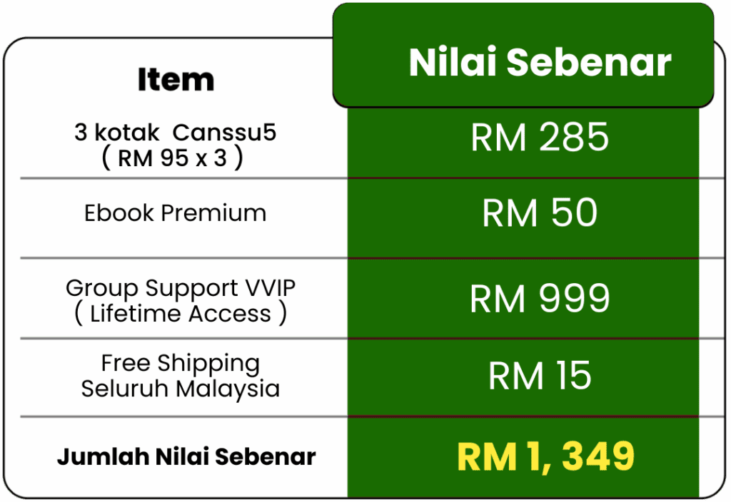 T&C : Pastikan sebelum anda consume canssu5 dengan konsisten setiap hari . Ambil bacaan asid urik sebelum consume.